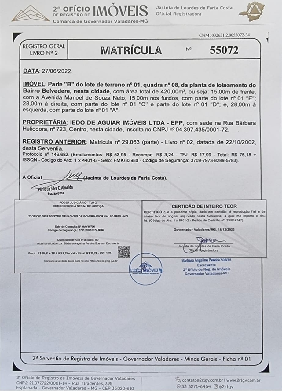 Parte B do lote de terreno nº 1, quadra nº 8 da planta do loteamento Bairro Belvedere, nesta cidade, com área total de 420,00m2, ou seja: 15,00m de frente com a Avenida Manoel de Souza Neto; 15,00 nos fundos com a parte do lote nº 01 E, 28,00 à direita com parte do lote nº 01 C e parte do lote nº 01 D, e 28,00m à esquerda com parte do lote nº 01 A.